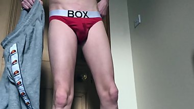 Hot Hung Straight Curious Teen in BOX Briefs Putting On Tight Grey Joggers