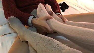 two teen girls footjob for a man with white and grey thick lace stockings
